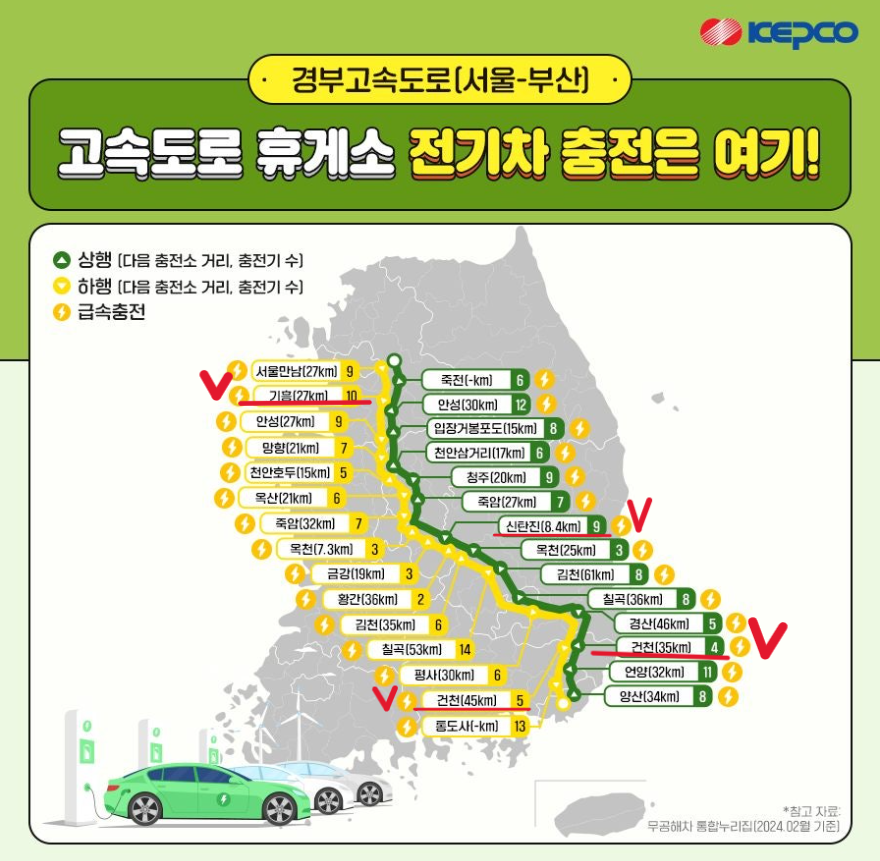 급속 전기차 충전소 시설이 구비되어 있는 휴게소를 미리 알아 놓으셔야 합니다.